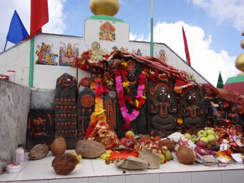 The roofless temple of Shikari Devi has the idols of Goddess Durga sitting on a lion,Goddess Kali, 64 yogini and demi hero (Kamarunag Devta). There are some other images of local gods sitting behind the image of Goddess Durga in this temple premises. Goddess Durga in this area is popularly known as “Shikari Devi”.